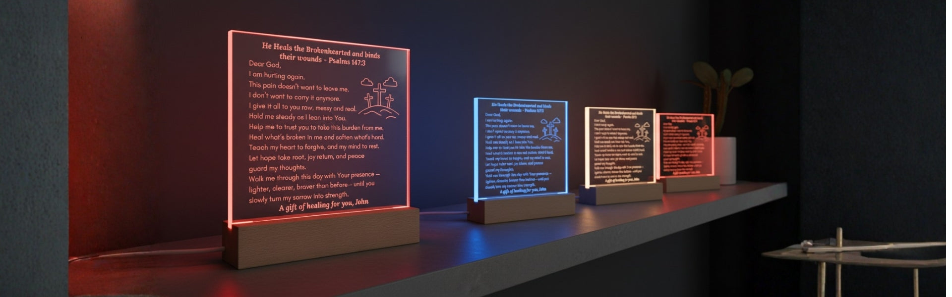 Discover our stunning collection of LED acrylic plaques featuring faith-inspired prayers and messages. Each premium crystal-clear plaque is professionally laser-engraved with uplifting words of comfort, hope, and encouragement.