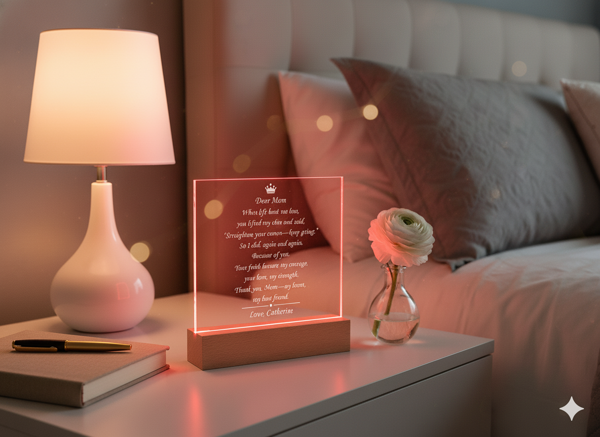 Every plaque is crafted from premium crystal-clear acrylic with professionally laser-engraved details that capture every word with precision and clarity. The elegant LED wooden base features multi-color display options and adjustable brightness, allowing you to create the perfect ambiance for prayer, reflection, or comfort. Energy-efficient and built to last, this is a keepsake designed to inspire and encourage for years to come.
